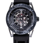 The 42mm 316L stainless steel case and black case with black PVD treatment, with a carbon bezel forged in both versions.