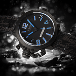 Three superimposed dials in black metal with visible opening on leverage. Indexes and numbers with indexes in brushed metal treated with blue superluminova. Hands in painted metal treated with blue superluminova.