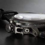 In AISI 316L stainless steel with subsequent PVD treatment, round sapphire glass side window. Patented crown protection on the left, lever with patented crown extraction system at 10 o'clock. 45 mm diameter.