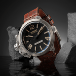 In AISI 316L stainless steel, round sapphire side window. Patented crown protection on the left, lever with patented crown extraction system at 10 o'clock. 50 mm diameter.