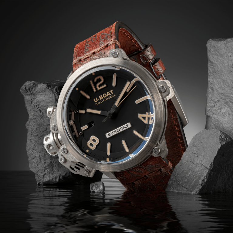 Sellita SW 200 Swiss automatic mechanical, personalized to U-BOAT specifications. Frequency: 28,800 vibrations per hour. Power reserve: 41 hours. 26 jewels. Skeletonized rotor.