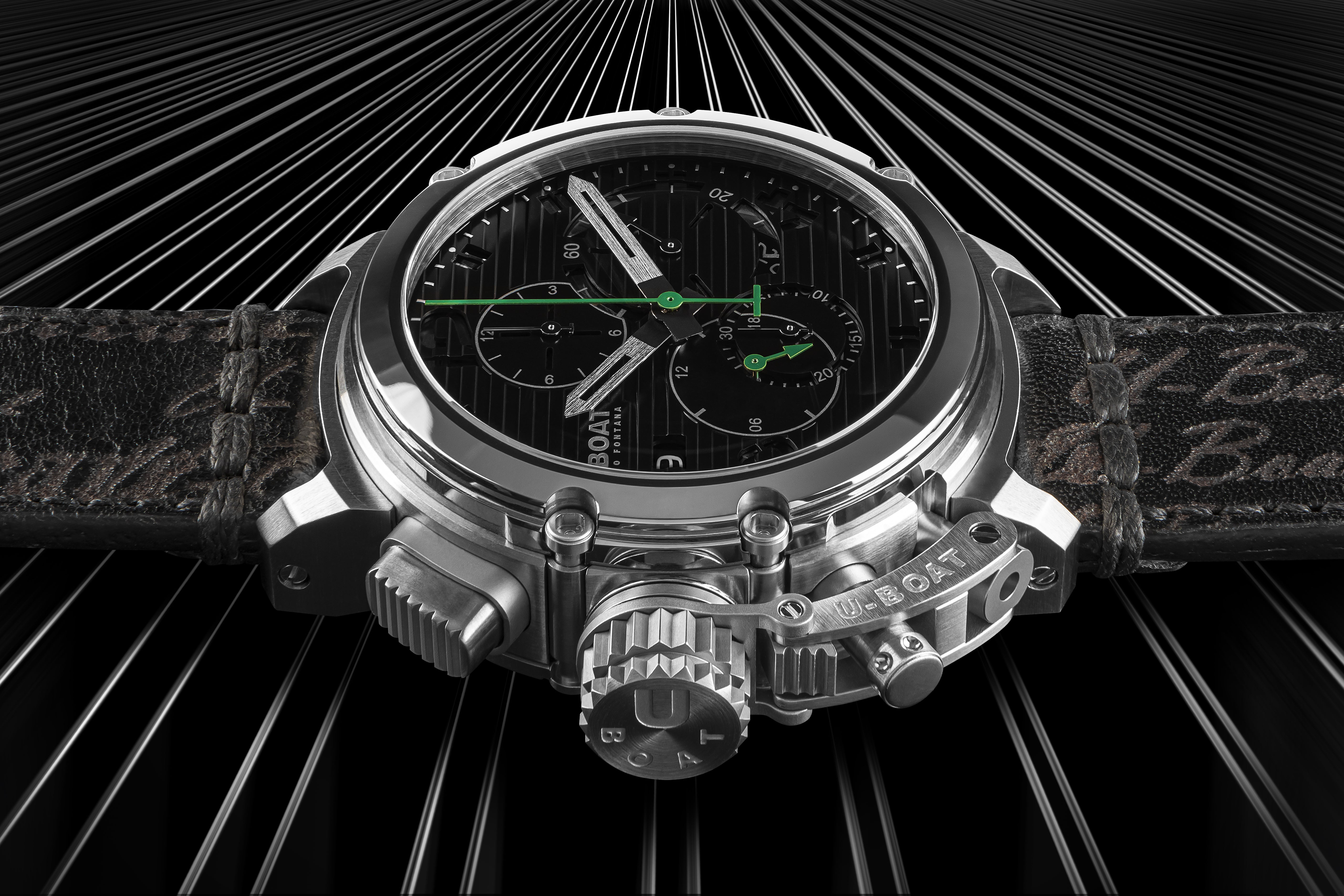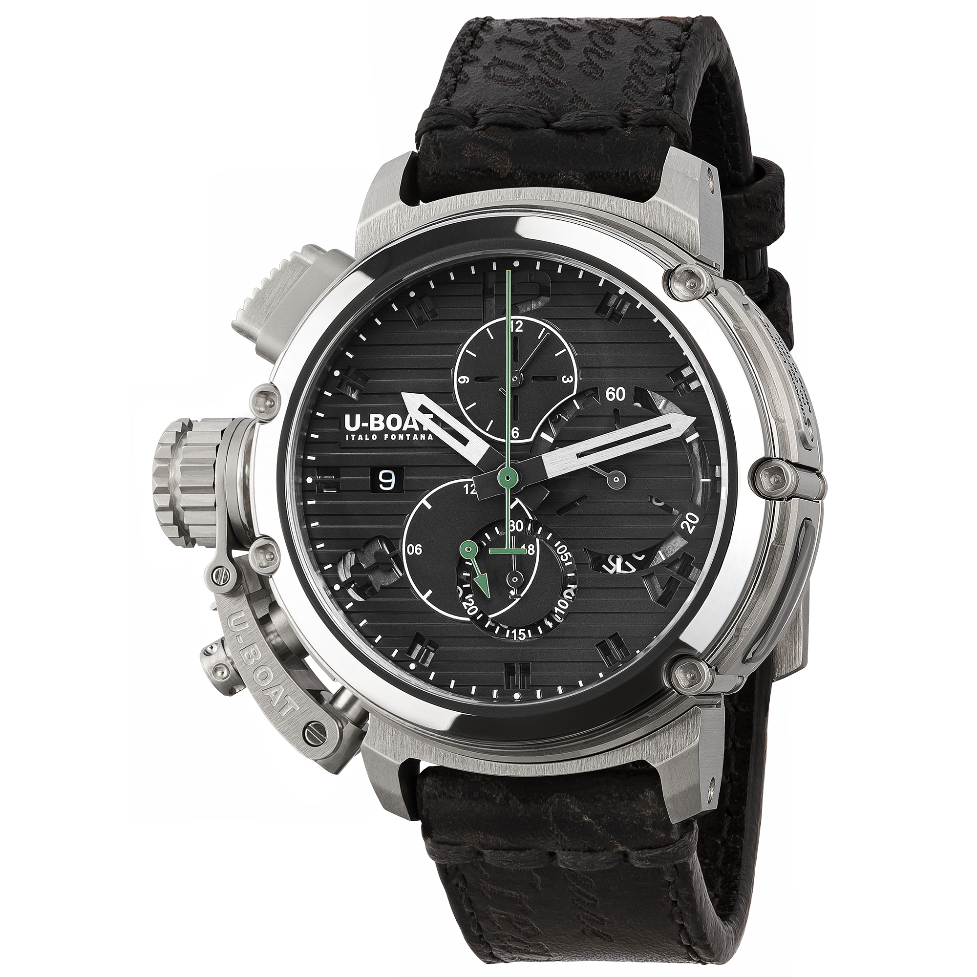 mechanical automatic chronograph Sellita SW 500, elaborated and modified according to U-BOAT specifications. Frequency 28,800 alternations/hour (4 Hz). Power reserve of 62 hours. 25 jewels. U-BOAT rotor in brass and tungsten, perlage processing and rhodium-plated. Screwed bridges.