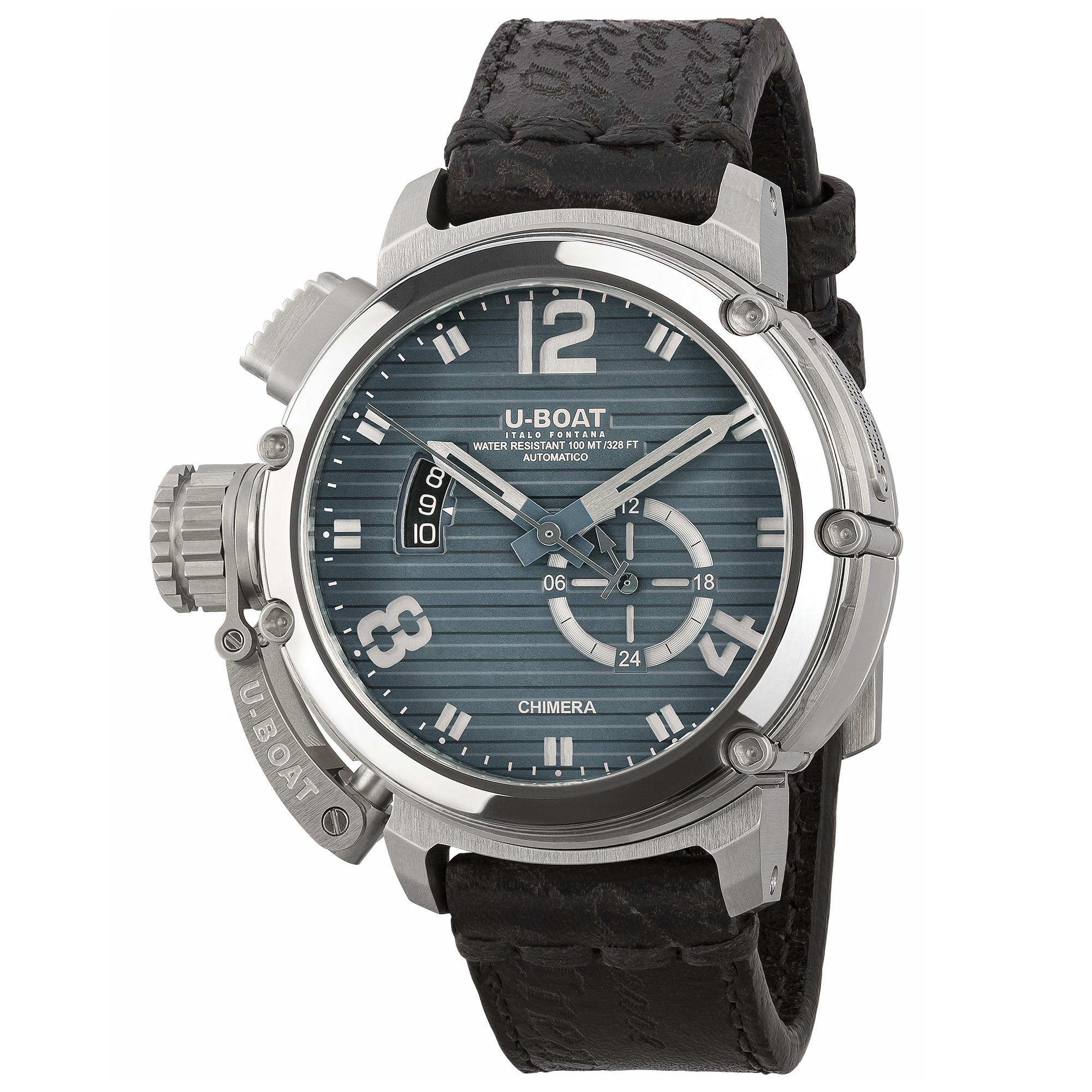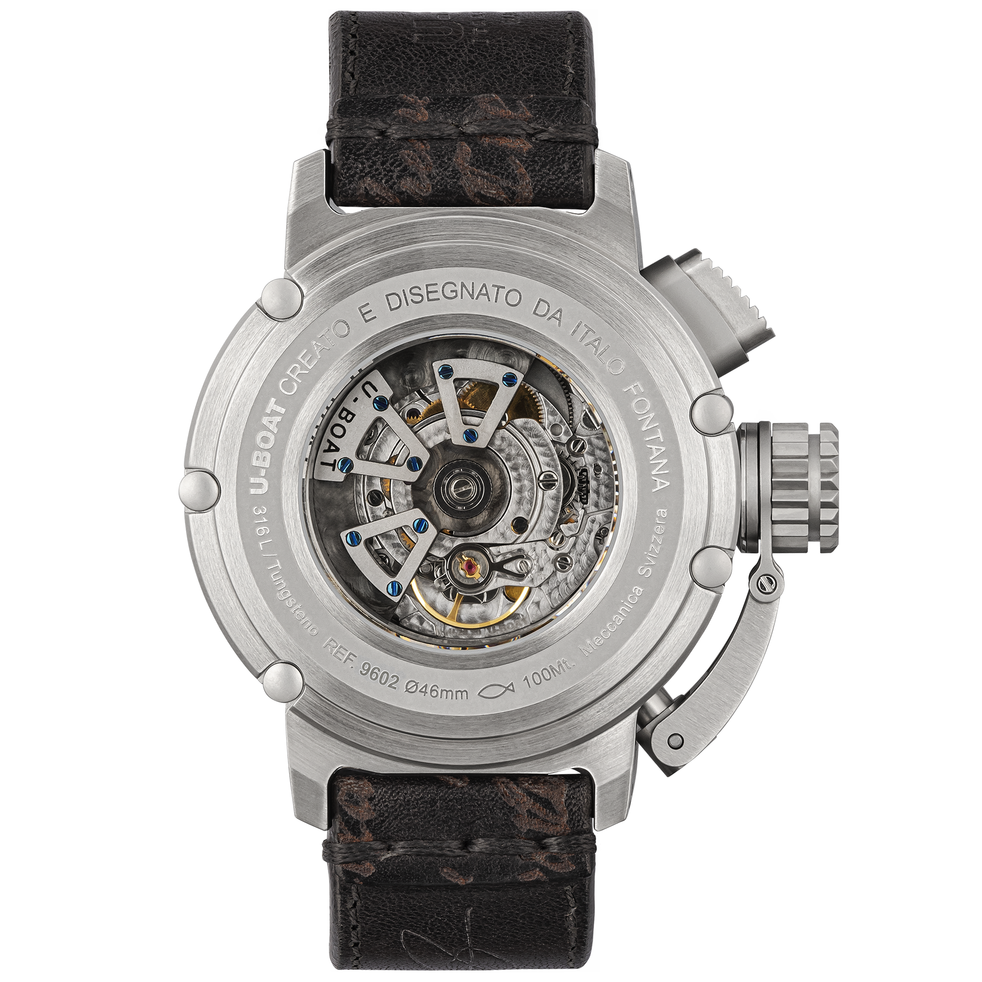 Swiss automatic mechanical ETA 2824 Top Soigné, elaborated and modified according to U-BOAT specifications. Frequency 28,800 alternations/hour (4Hz). Power reserve 38 hours. 25 jewels. U-BOAT rotor in brass and tungsten, perlage processing and rhodium-plated. Screwed bridges.