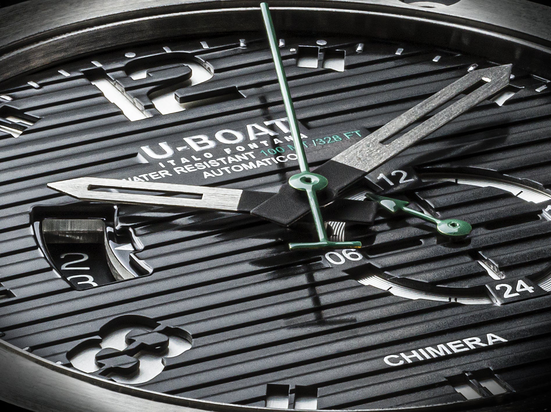 Swiss automatic mechanical ETA 2824 Top Soigné, elaborated and modified according to U-BOAT specifications. Frequency 28,800 alternations/hour (4Hz). Power reserve 38 hours. 25 jewels. U-BOAT rotor in brass and tungsten, perlage processing and rhodium-plated. Screwed bridges.