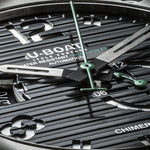 two overlapping levels. Upper part in black painted striped metal dial. Numbers, indexes and indicator with laser cutting. Lower part in brushed metal. Hour and minute hands in brushed and painted metal with laser-cutting. Seconds hand and 24h indicator in brushed and painted metal.