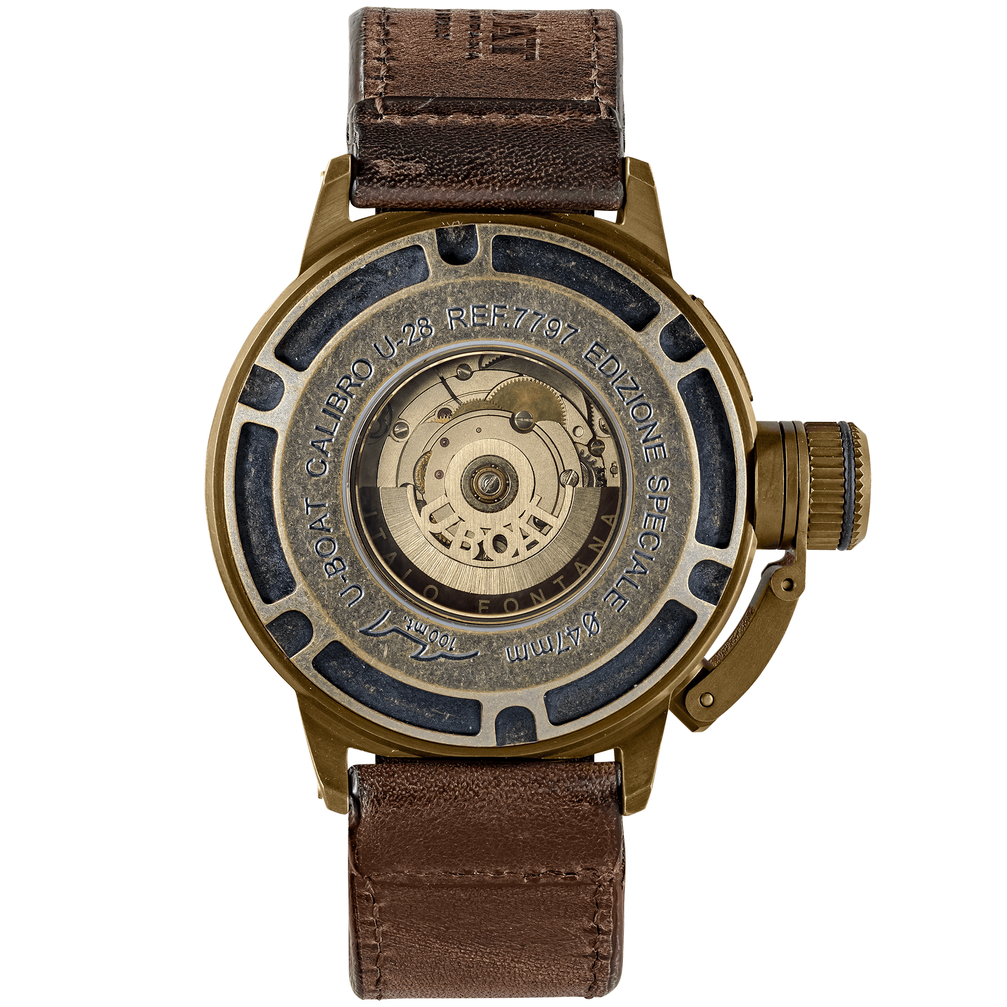 Automatic mechanical, personalized to U-BOAT specifications for stem to be positioned at 9 o’clock. Frequency: 28,800 vibrations per hour, 4 Hz. Power reserve: 41 hours. 26 jewels. Skeletonized rotor as by U-BOAT specifications.