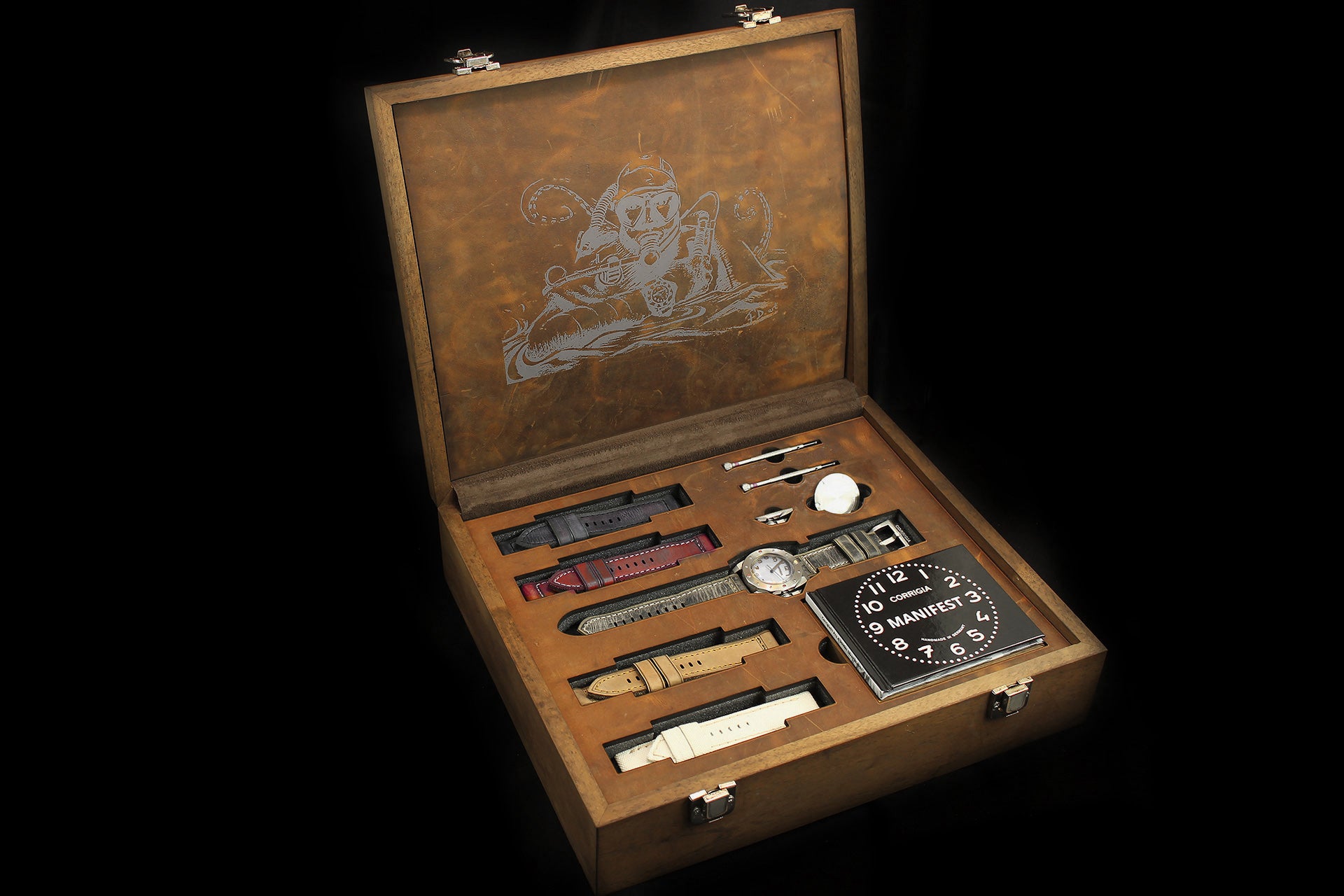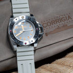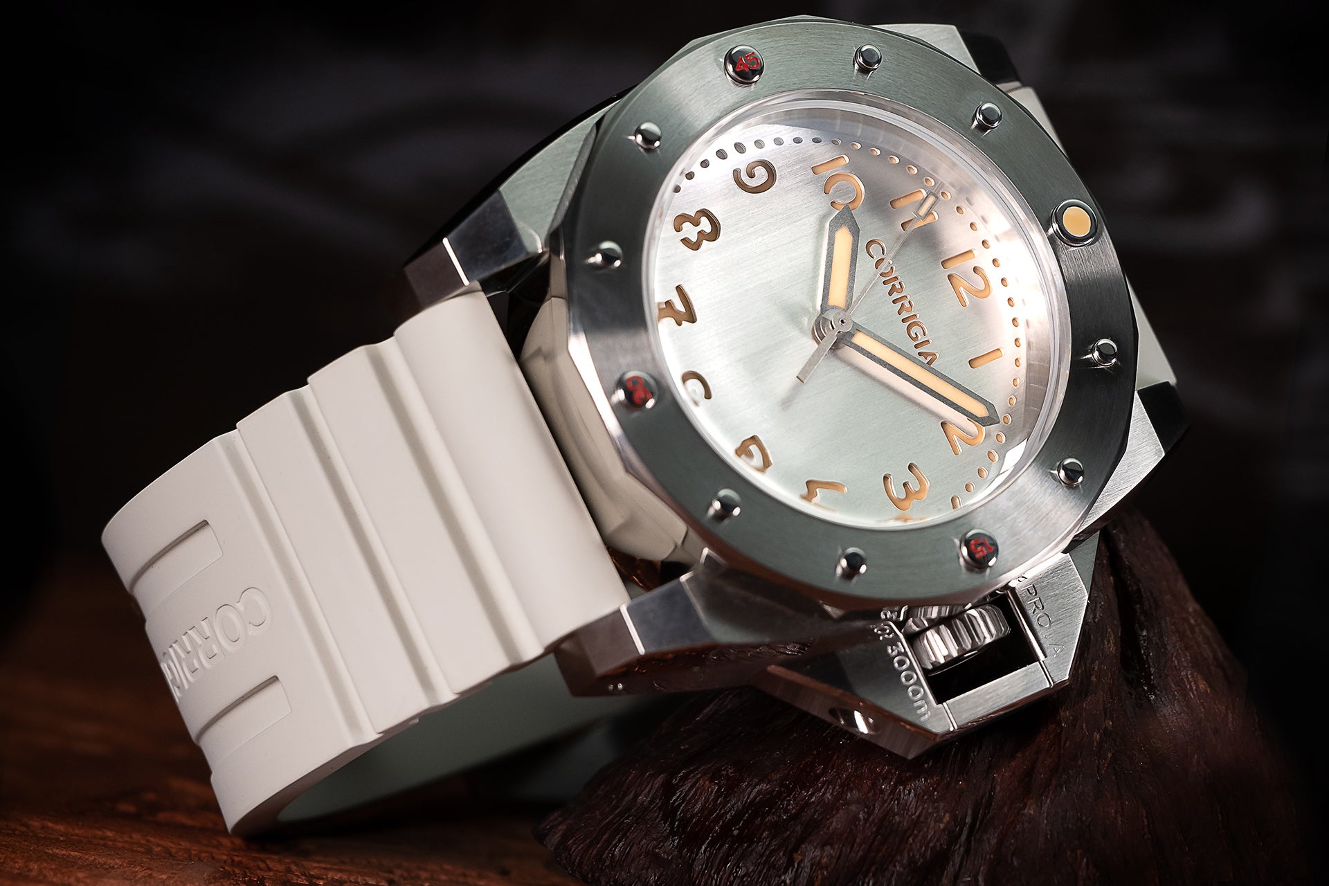 The Corrigia02 wristwatches are made of stainless steel and feature a 4.8mm thick curved sapphire crystal. The bezel is unidirectional with 120 clicks and has an O-ring underneath. The lugs and crown are screw-down and executed with double seals. The sandwich dial consists of two layers and is filled by hand in Switzerland with high-quality Swiss Super-LumiNova® SLN Old Radium in 80 steps. The watch is water-resistant up to a depth of 30 ATM with a glass back and up to a depth of 300 ATM with a solid steel back. Each Corrigia02 watch is powered by a Swiss-made automatic manufacture caliber with a power reserve of 70 hours.