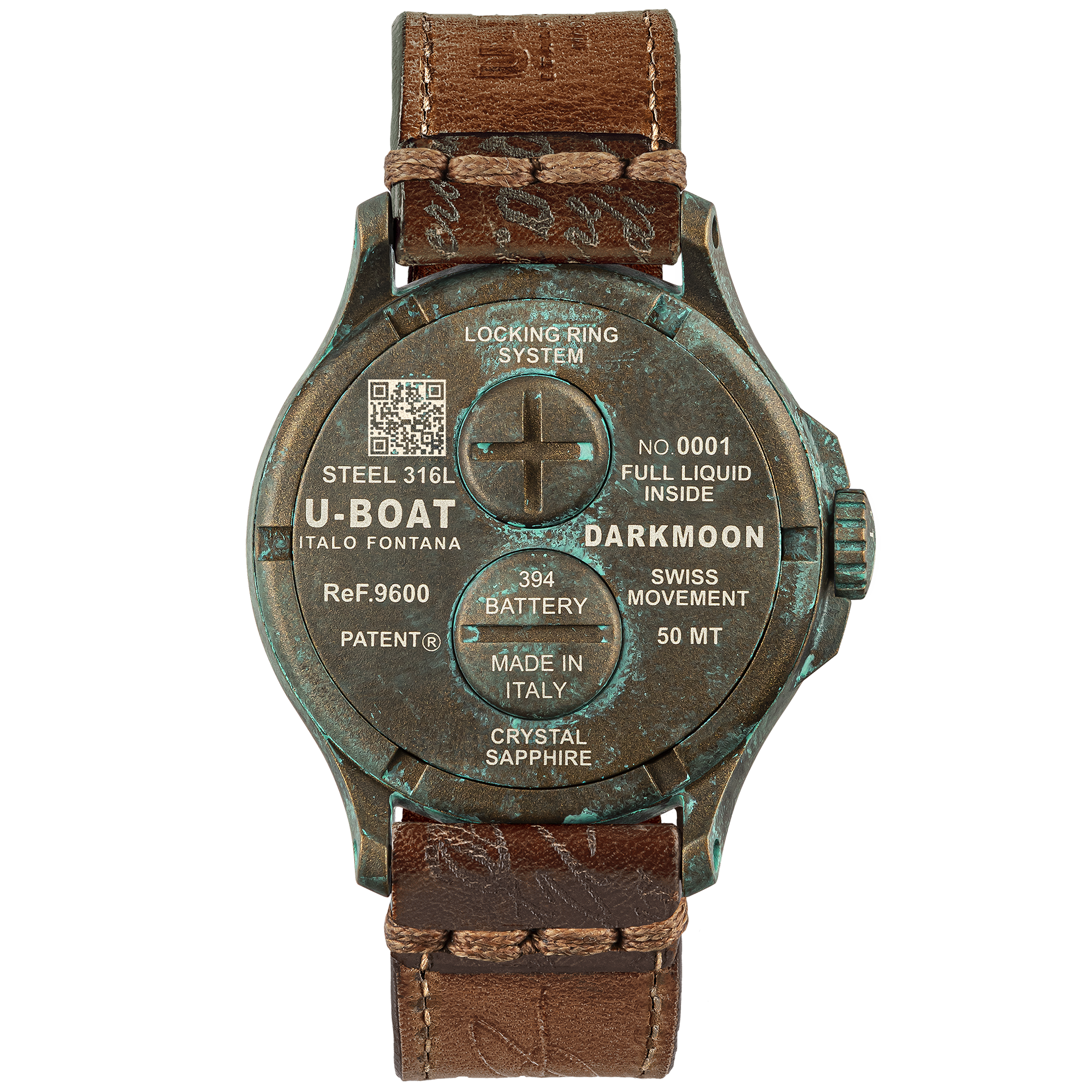 made of AISI 316L steel with aged bronze PVD treatment, with a special manual treatment using various overlapping acids to create an oxidized and antiqued effect. The case is filled with a special oil that highlights the dial, creating the illusion of the absence of glass, with a more intense color effect and enhanced readability. Visible air bubble on the dial to compensate for temperature variations. Distinctive crown protector on the left. 44.8 mm diameter.