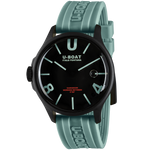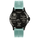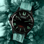 Electromechanical movement completely immersed in an oil bath. Black PVD-treated steel case, black dial, and numerals, indexes and hands treated in tourquise superluminova. “Oil Immersion” concept in 44mm size.
