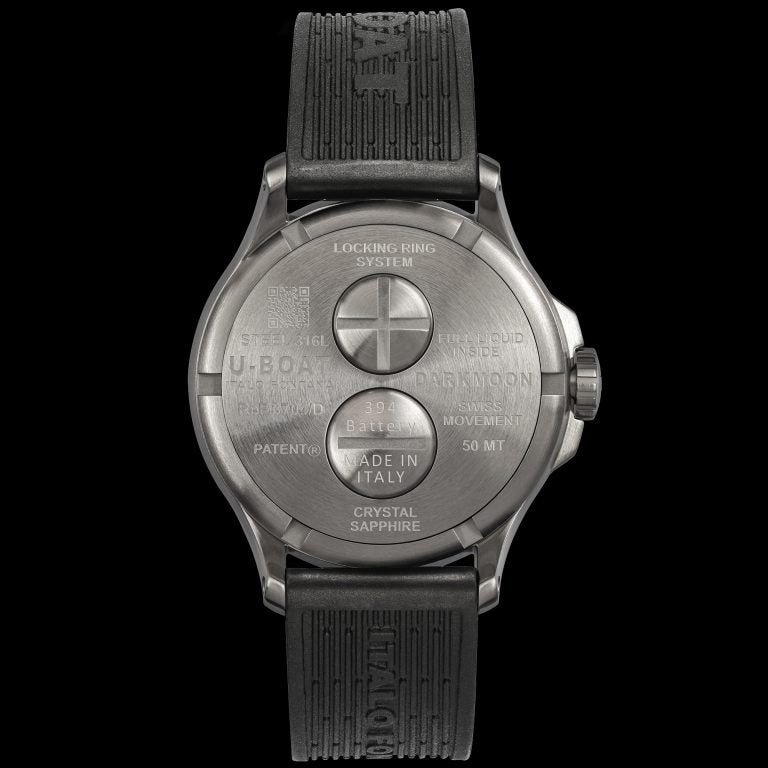 A collection inspired by the dark side of the moon. The case is completely filled with a special oil that emphasizes the dial, made in blue metal with soleil finishing, creating an optical effect of a more intense color and higher legibility. Innovative locking system (Locking Ring System) with quick battery replacement.