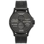 Stainless steel AISI 316L. with subsequent PVD treatment, completely filled with a special oil that emphasizes the dial, creating the illusion of the absence of glass, and an optical effect of an higher legibility. Visible air bubble on the dial to compensate the temperature variations. Distinguishing crown on left side. Diameter 44,80 mm.
