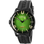 A collection inspired by the dark side of the moon. The PVD case is completely filled with a special oil that emphasizes the dial, made in green metal with soleil finishing, creating an optical effect of a more intense color and higher legibility. Innovative locking system (Locking Ring System) with quick battery replacement.