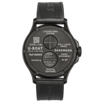 Stainless steel AISI 316L. with subsequent PVD treatment, completely filled with a special oil that emphasizes the dial, creating the illusion of the absence of glass, and an optical effect of an higher legibility. Visible air bubble on the dial to compensate the temperature variations. Distinguishing crown on left side. Diameter 44,80 mm.