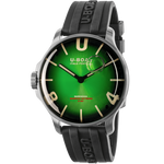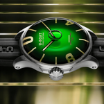 Domed, green metal with brushed soleil finishing, hands and indexes treated with beige superluminova.