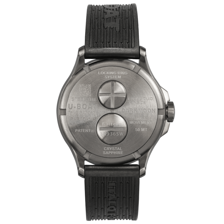 A collection inspired by the dark side of the moon. The case is completely filled with a special oil that emphasizes the dial, made in green metal with soleil finishing, creating an optical effect of a more intense color and higher legibility. Innovative locking system (Locking Ring System) with quick battery replacement.