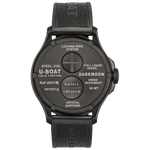Stainless steel AISI 316L. with subsequent PVD treatment, completely filled with a special oil that emphasizes the dial, creating the illusion of the absence of glass, and an optical effect of an higher legibility. Visible air bubble on the dial to compensate the temperature variations. Distinguishing crown on left side. Diameter 44,80 mm.