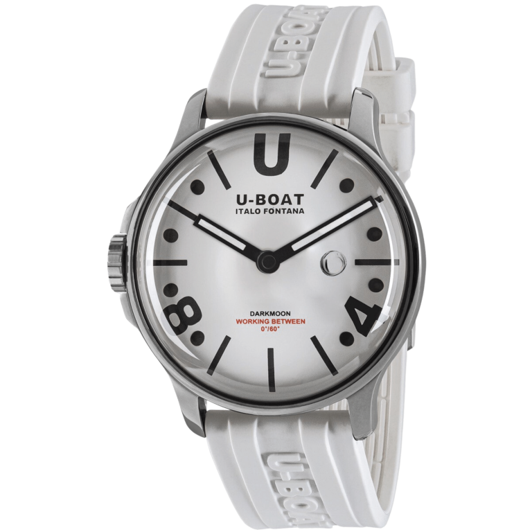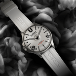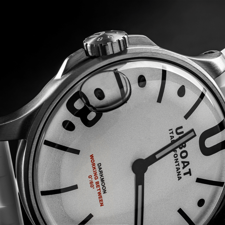 Black and white contrast! 44mm size with a new domed dial emphasizing the 3D effect. “Oil Immersion” concept, steel case, white dial with numerals, indexes and hands in black.