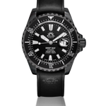 45 mm brushed steel black case boasts a unidirectional steel bezel with ceramic inserts, sapphire crystal and three types of dials: one black, one blu and one green in the upper half that fades to black in the lower; all of them are characterized by superluminova indexes and hands. The rubber straps, the water resistant handmade in Italy leather band and 316L vertical brushed solid SS PVD black band, complete the bold and marked design of the timepiece