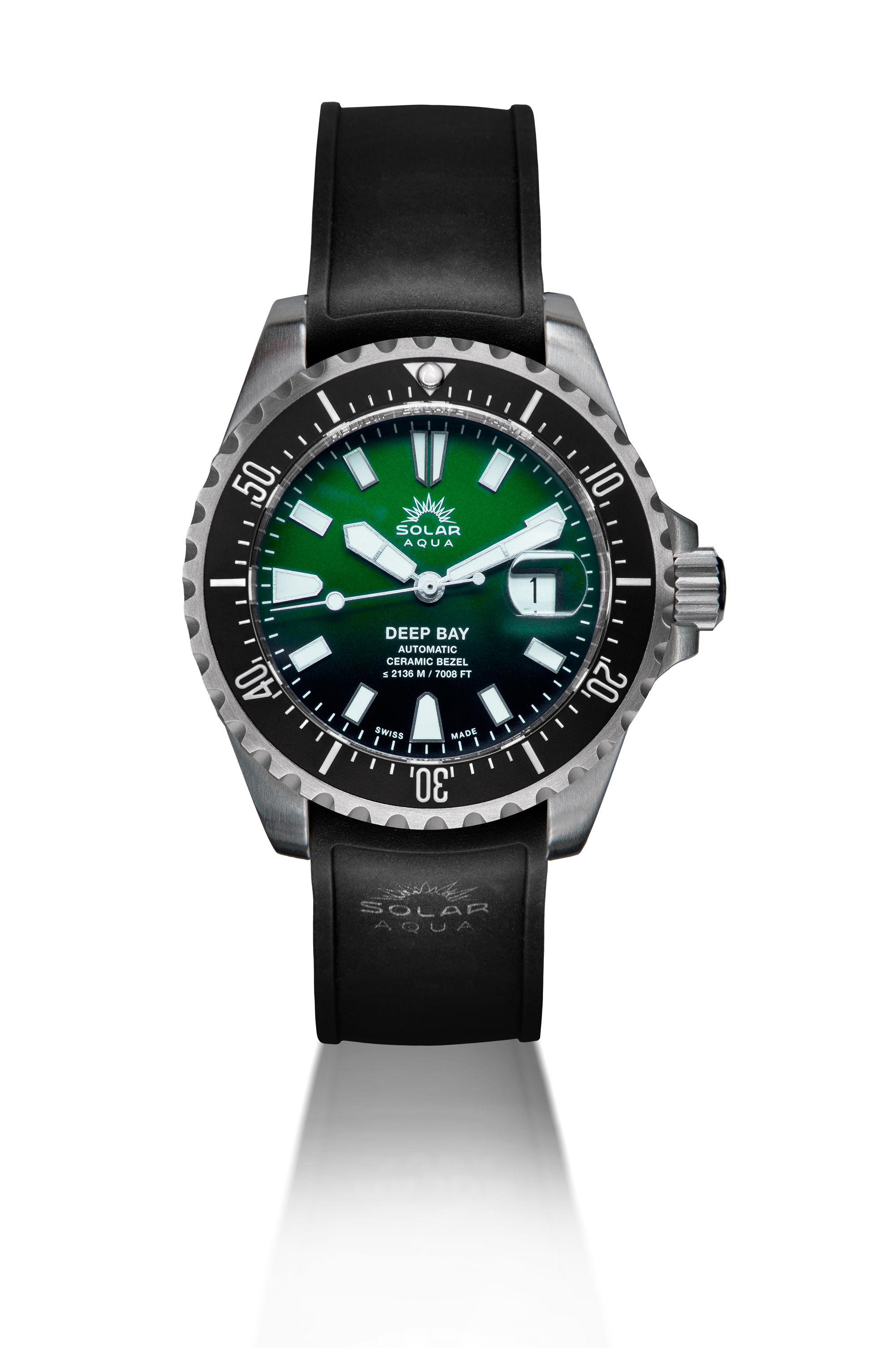 45 mm brushed steel case boasts a unidirectional steel bezel with ceramic inserts, sapphire crystal and three types of dials: one black, one blu and one green in the upper half that fades to black in the lower; all of them are characterized by superluminova indexes and hands. Stainless steel case back. The rubber straps, the water resistant handmade in Italy leather band and the steel bracelets complete the bold and marked design of the timepiece.