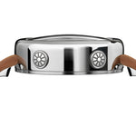 The Manometro Chronograph performance has been enhanced by the use of a prestigious Dubois-Dépraz, automatic bi-directional, 42-hour power reserve caliber 2030 movement. It’s covered by a closed back held to the 45 mm case by 8 screws, 4 of which also secure the beautiful hand sewn leather strap.
