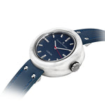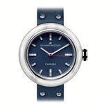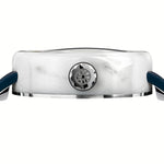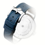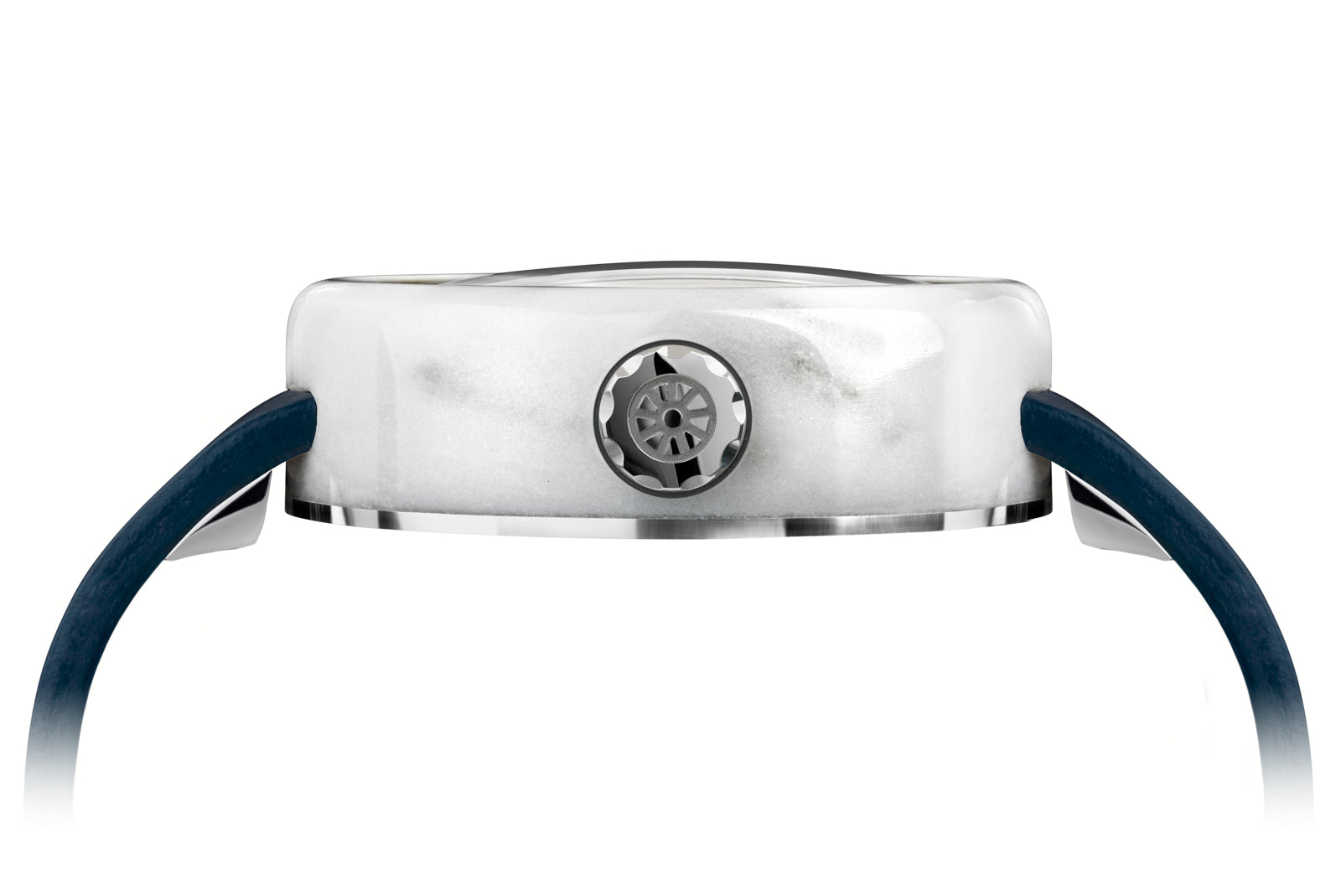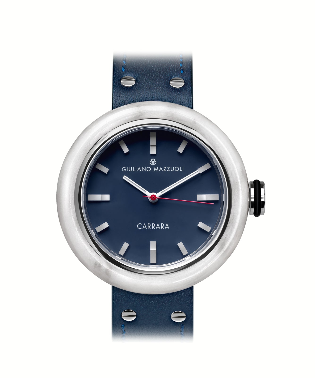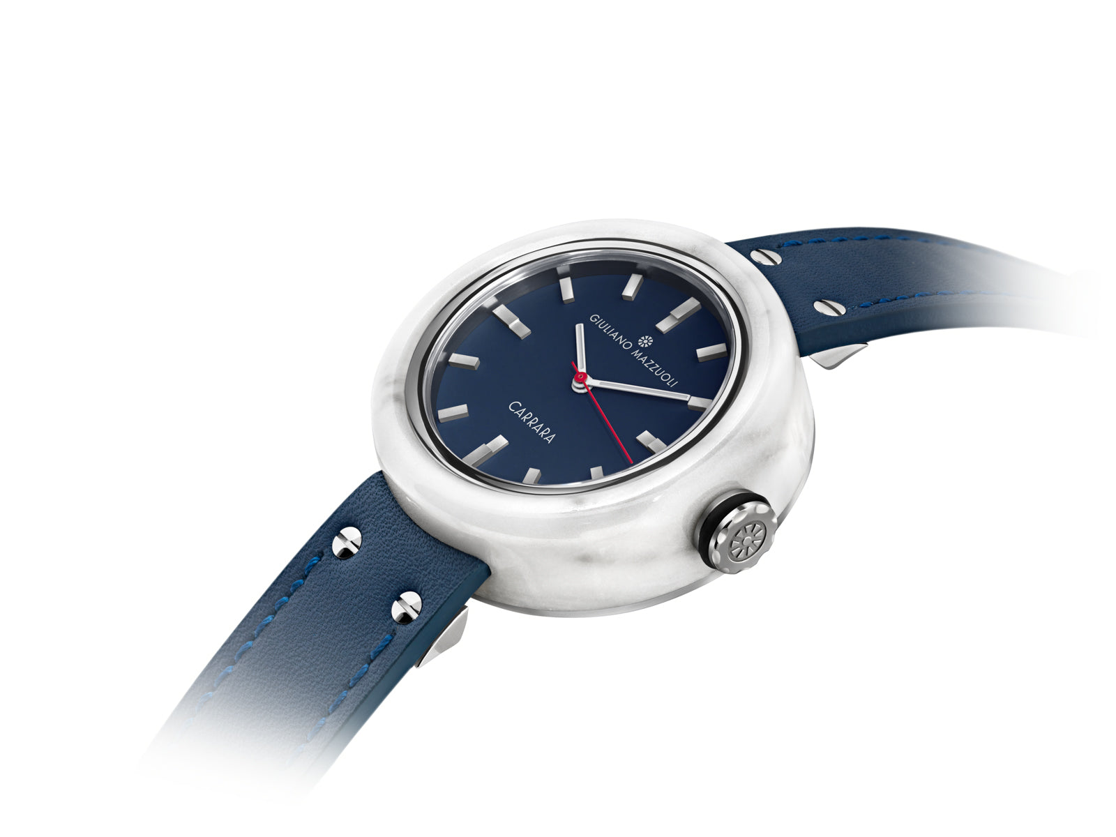 Each lot of marble is different and each stone has its own characteristics making every piece of Giuliano Mazzuoli’s Carrara watch unique. In manufacturing the watch, Swiss watchmaking is combined with traditional Italian craftsmanship and design. The marble case, made manually in Italy by master marble workers, houses a high-performance Swiss automatic movement. A metal ring is inserted into the inner chamber and when bonded to the marble it strengthens the structure making it less susceptible to breakage. Unlike other Mazzuoli watches, the crown in this watch is positioned at 3 o’clock giving the watch more of a classic and traditional feel. The large dimension crown is decorated with a white rubber “o” ring making it even easier to grip. The dial is in ceramic gun metal, blue or white color. The cuboid rectangular minute indexes are raised giving a three-dimensional aspect to the dial and represent the blocks of marble that sit in marble quarries or in marble workshops. As is typical in all of Giuliano Mazzuoli watches, the strap is inserted directly into the case and it is made in Tuscany in calf-skin leather. Giuliano Mazzuoli’s Carrara wristwatch is a tribute to his Tuscan origins.
