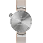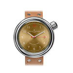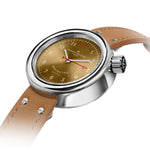 The watch is designed in Italy by Giuliano Mazzuoli and produced in Switzerland with a high precision Swiss movement. It is constructed using only the finest materials by master watchmakers. Combining the best Swiss technology with Italian design, the watch is unique in its simplicity and essential style. Beyond its creative design elements, the watch’s technical characteristics include a precision Swiss automatic movement and the case is made of stainless steel INOX AISI 316/L in either brushed or polished finishes. The color of the dial is dark blonde, and it is covered with a convex sapphire glass. The watch’s leather strap is made in Tuscany of natural calf-skin and it has a stainless steel buckle with the Mazzuoli logo inscribed on it.