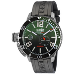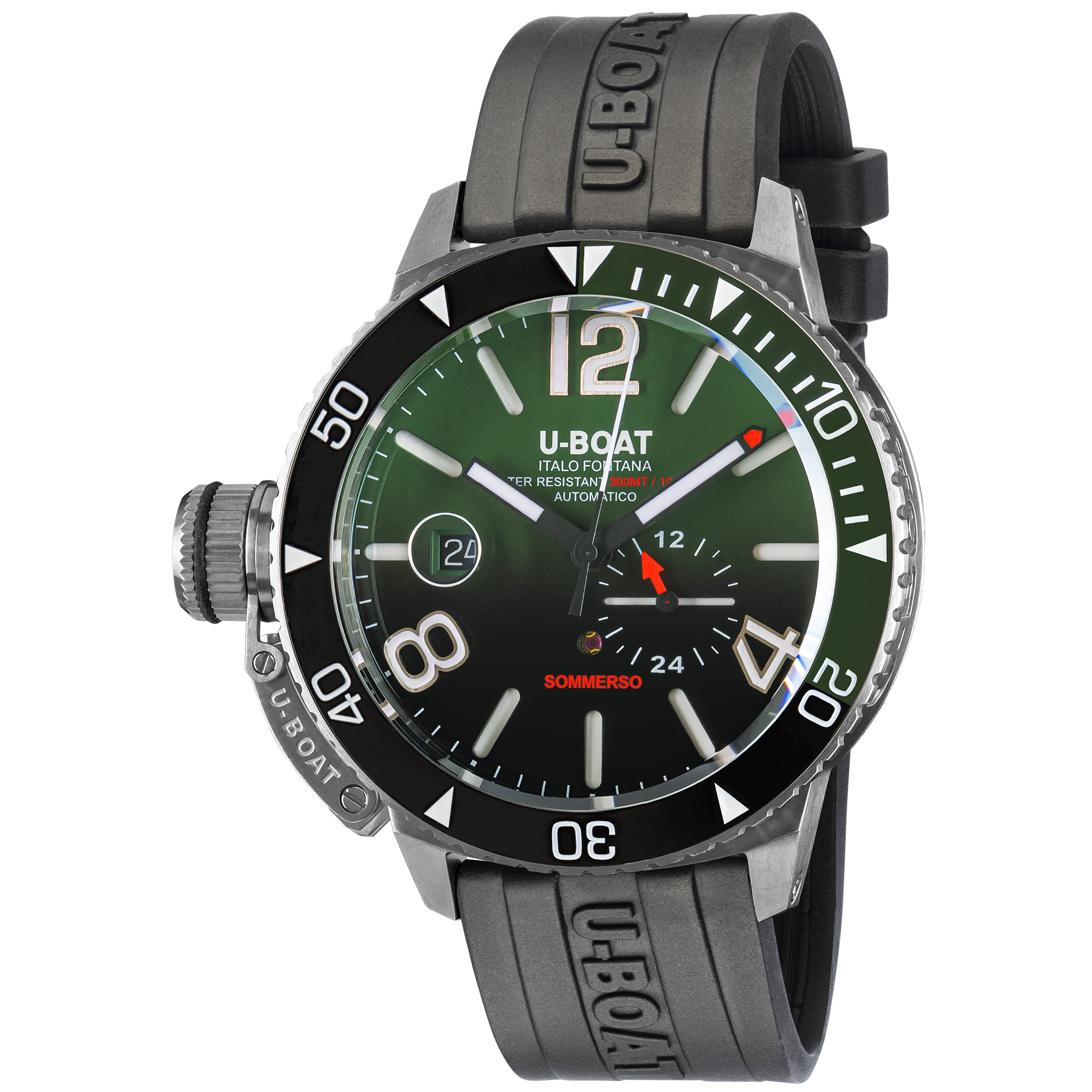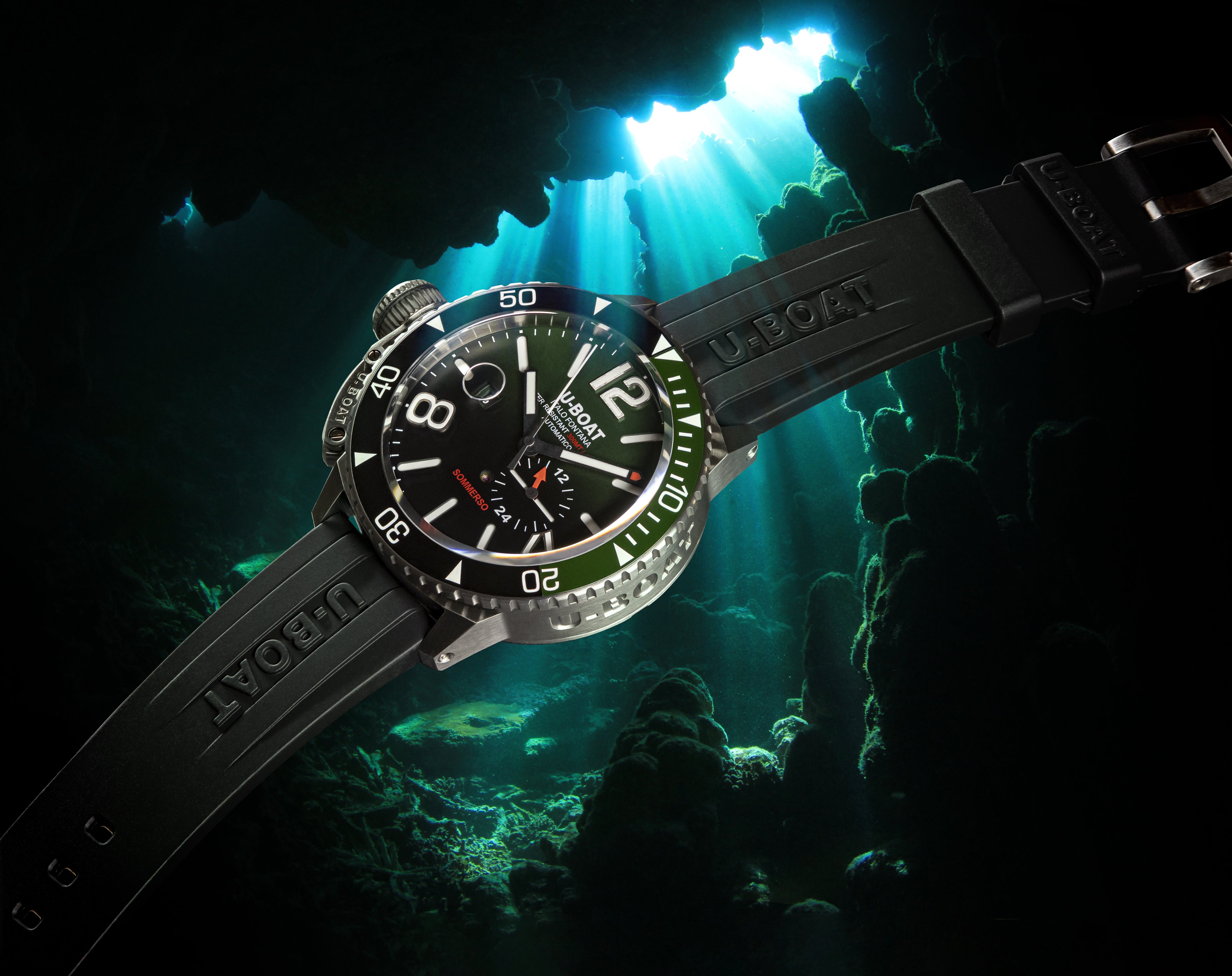 Aesthetics and technique, elegance and sportiness perfectly blended! Two-tone (green and black) bezel and dial, vulcanized rubber strap. Water-resistant up to 30 ATM.