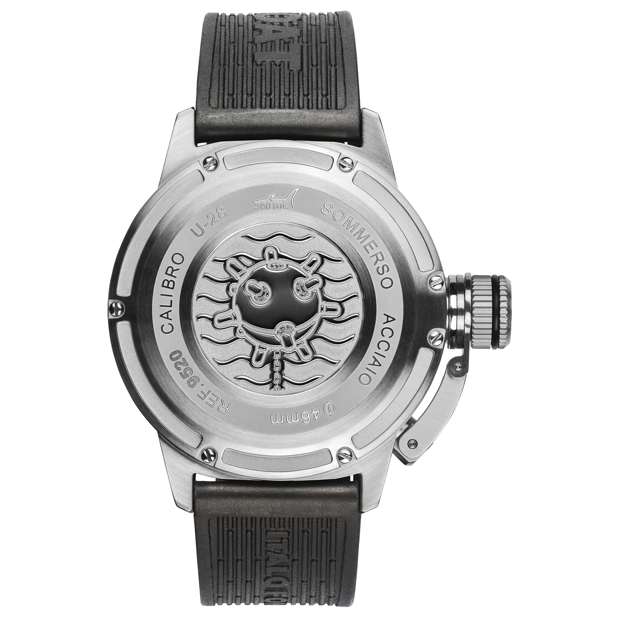 Sellita SW 200 swiss automatic mechanical, personalized to U-BOAT specifications. Frequency: 28,800 vibrations per hour, 4 Hz. Power reserve: 41 hours. 26 jewels. Skeletonized rotor.
