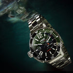 Beyond the deep limit, every moment, an adventure without boundaries! Water-resistant up to 30 ATM, with a two-tone dial and bezel (green and black). Featuring a metal bracelet.